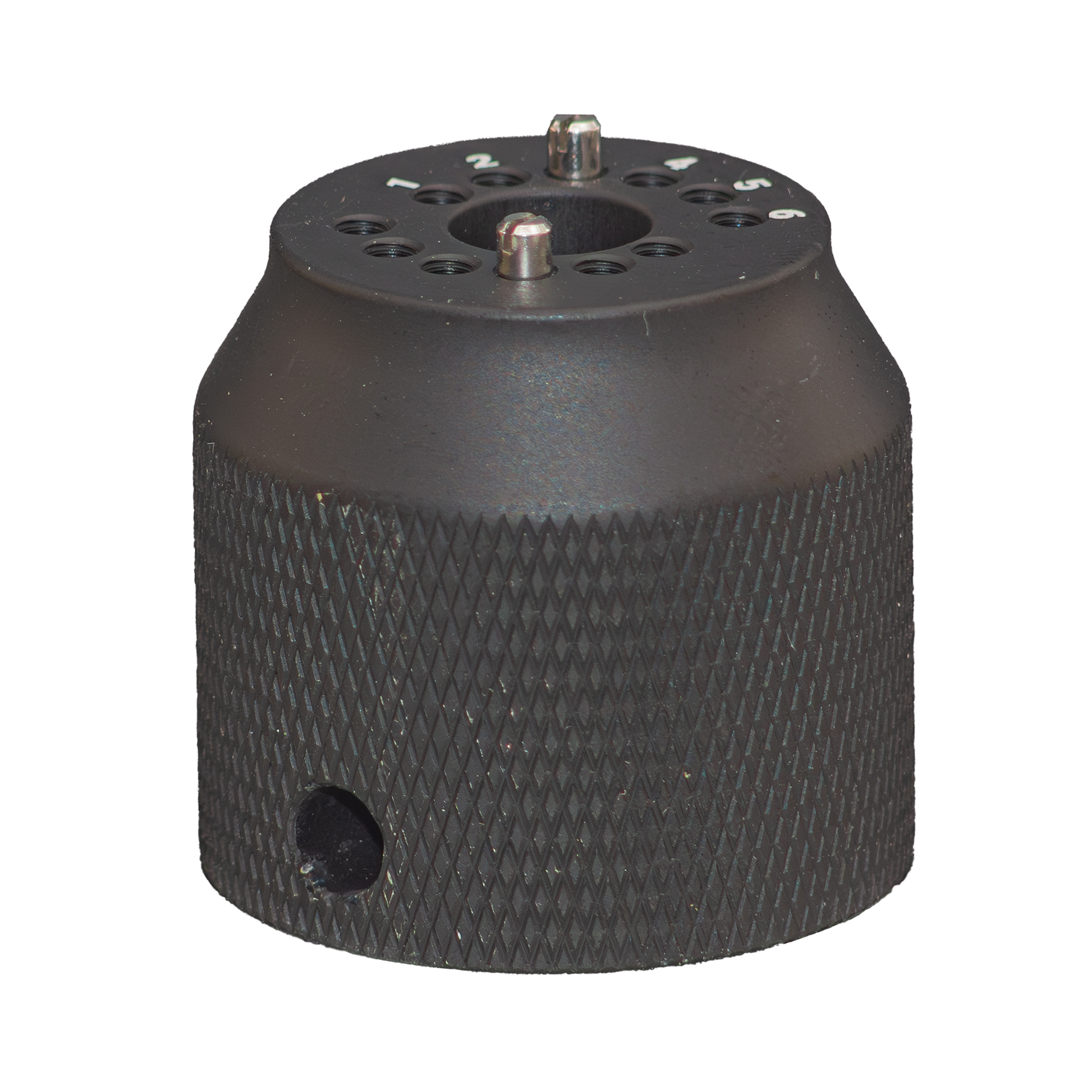 On the top are differently spaced holes and adjustable pins, so the tool can be used with different brands of cylinder heads.